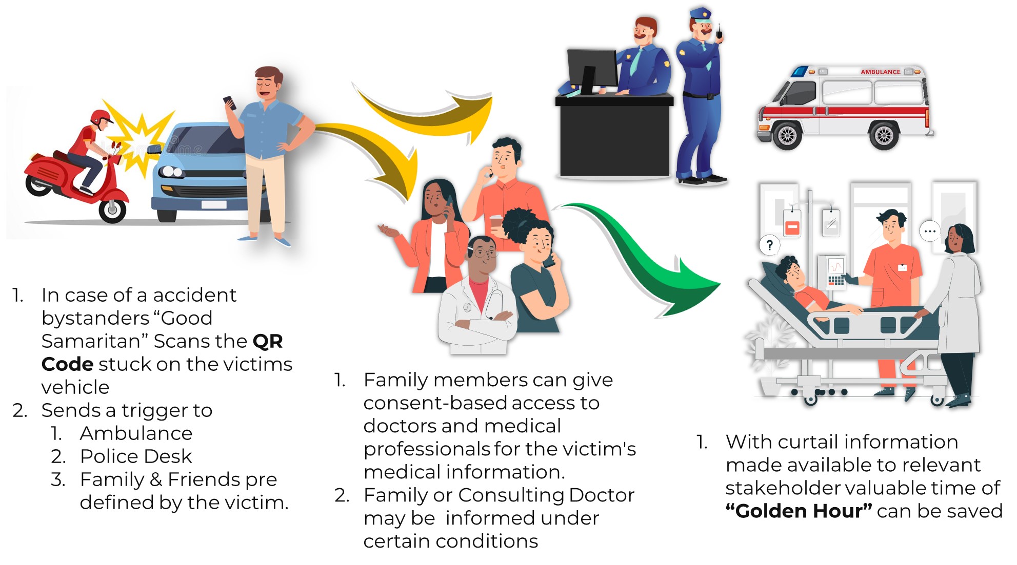 A Good Samaritan is a bystander who takes the accident victim to the nearest hospital or helps the victim by informing police or medical emergency and with help of merasafety QR can also contact the Family members.